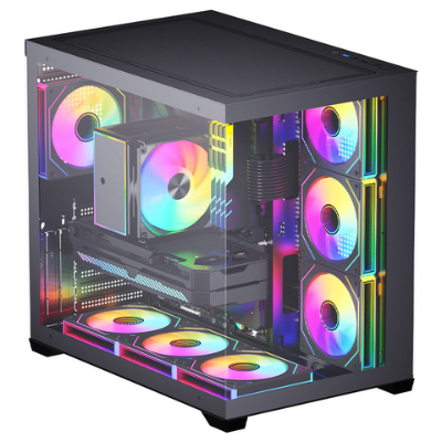 Incluye 4 ventiladores ARGB de 120mm, donde 3 ventiladores laterales son reversos, optimizando la entrada de aire y logrando un look limpio y profesional desde cualquier ángulo. El diseño interno soporta configuraciones avanzadas de refrigeración líquida, con compatibilidad para radiadores de hasta 360mm, ideal para CPUs y GPUs de alto consumo térmico.