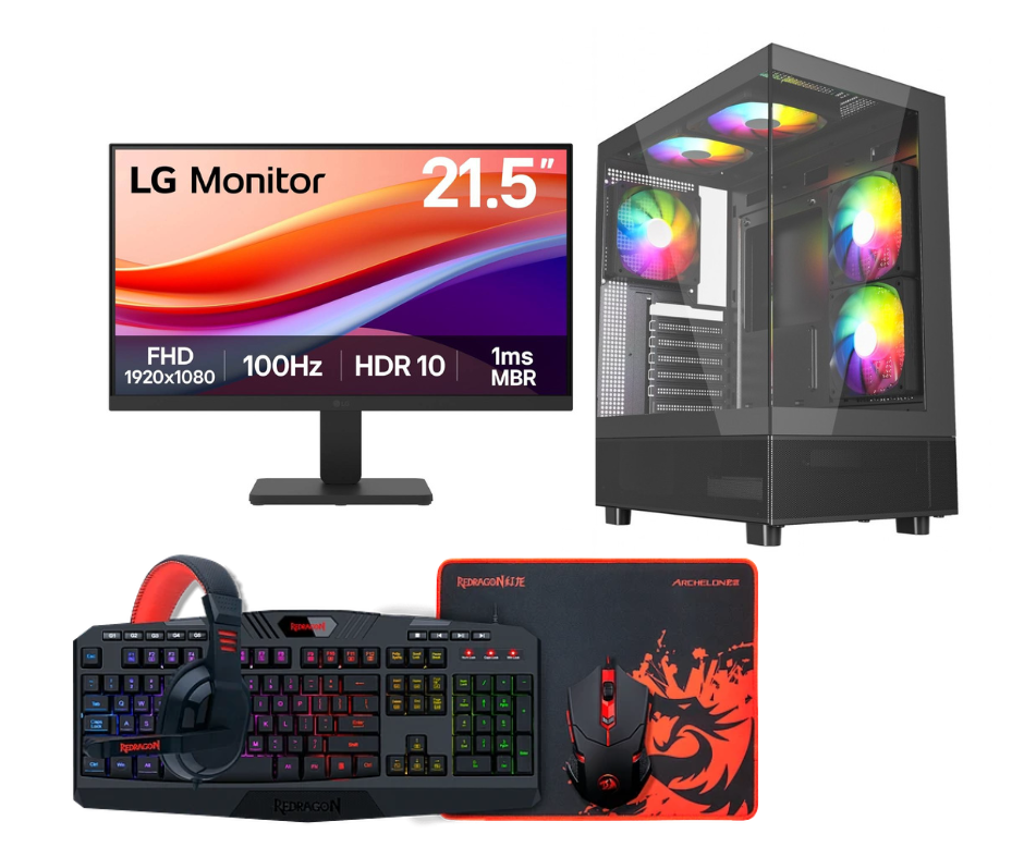 Incluye un monitor Full HD de 22” a 100Hz, que mejora notablemente la suavidad en juegos y navegación, además de un kit gamer Redragon completo para que no necesites comprar periféricos adicionales.